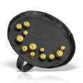 Spectacular ring with geometric design, handmade in black rhodium-plated silver, with satin-matt finish and gilded silver elements.