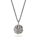Colier unisex cu pandantiv disc masiv, de mari dimensiuni, lucrat manual din argint antichizat, pe lant lung din argint antichizat negru.