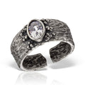 Inel-verigheta, ajustabil, lucrat manual din argint antichizat cu element central din zirconia transparenta.