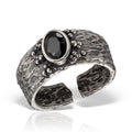 Inel-verigheta, ajustabil, lucrat manual din argint antichizat cu element central din zirconia neagra.