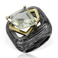 Inel in stil art-deco, lucrat manual din argint rodiat negru, argint aurit si citrin natural.