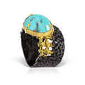 Inel in stil Art Nouveau, lucrat manual din argint rodiat negru cu turcoaz natural, in caseta din argint aurit.